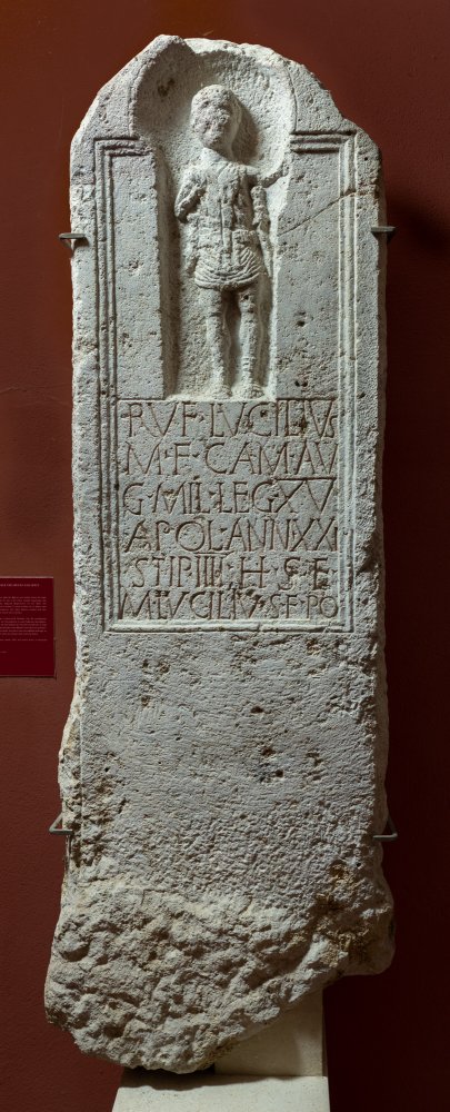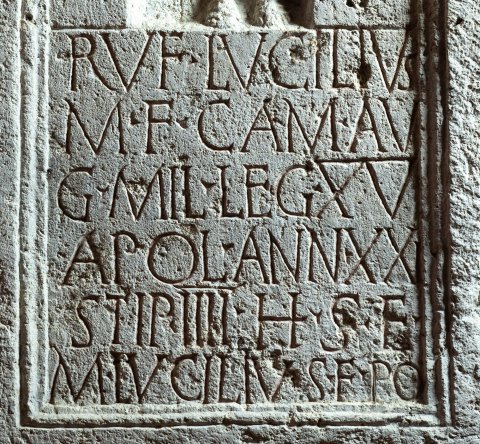 - Ruf(us) Lucilius / M(arci) f(ilius) Cam(ilia) Au/g(usta Bagienorum) mil(es) leg(ionis) XV / Apol(linaris) ann(orum) XXI / stip(endiorum) IIII h(ic) s(itus) e(st) / M(arcus) Lucilius f(rater) po(suit)