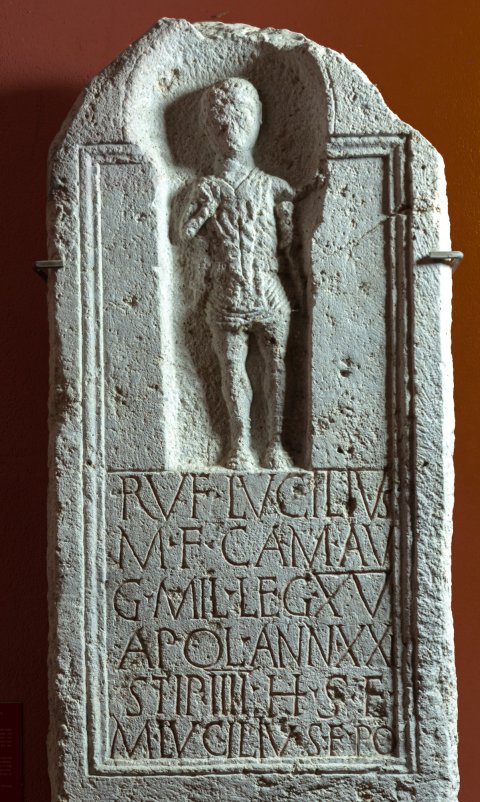 Rufus Lucilius, Sohn des Marcus, aus Augusta Bagienorum eingetragen in der Tribus Camilia, Soldat der 15. Legion Apollinaris, 21 Jahre alt, 4 Dienstjahre, liegt hier begraben. Marcus Lucilius, der Bruder hat den Grabstein aufgestellt.