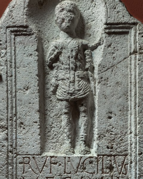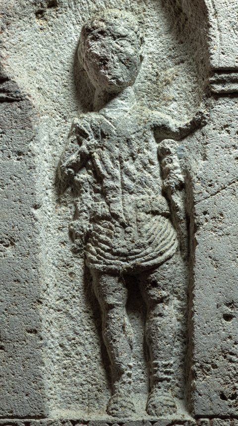 - In Bogennische Ganzfigur eines Mannes (Soldat): Streifenschurz, Paenula, Schnürschuhe. Waffen: Dolch, Schwert.