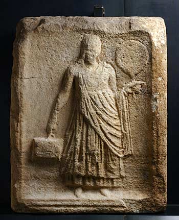Auf der Vorderseite (?) Dienerin: in Rechtecknische einheimisches Mädchen mit offenem Haar, Unter- und Obergewand, in den Gürtel ein großes Tuch gesteckt, in der Rechten Kästchen mit Griff, in der Linken Spiegel. - Kommentar