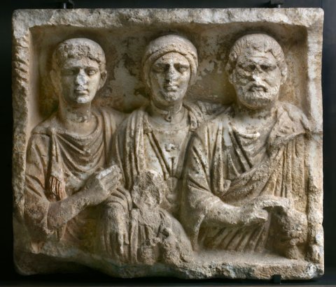 - Familie: in Rechtecknische zwischen Säulen mit Spiralkanneluren Halbfiguren von drei Erwachsenen und einem Kind. Links Jüngling: bartlos, Locken, Ärmeltunica, Sagum mit Fransen, Scheibenfibel. In der Mitte einheimische Frau: Haube, gegürtetes Gewand, Flügelfibeln, Brosche, Umhang, Halsreif mit Lunula. Rechts Mann: bärtig, gesträhntes Haar, Tunica, Toga contabulata, in der Linken Rolle (volumen). Vor der Frau Kind (Mädchen ?) mit Umhang, in der Linken Vogel.