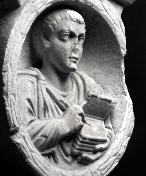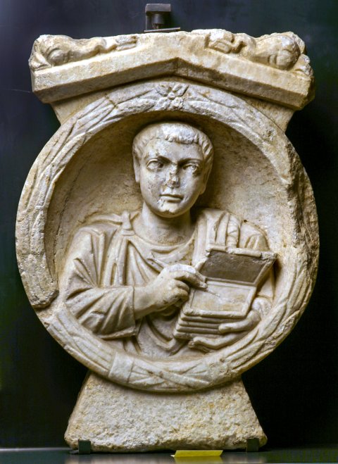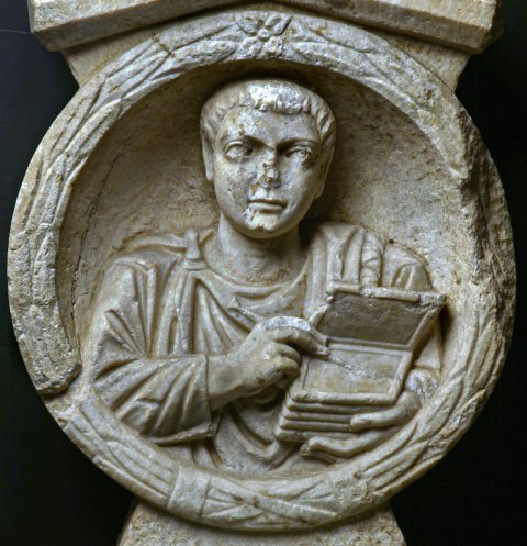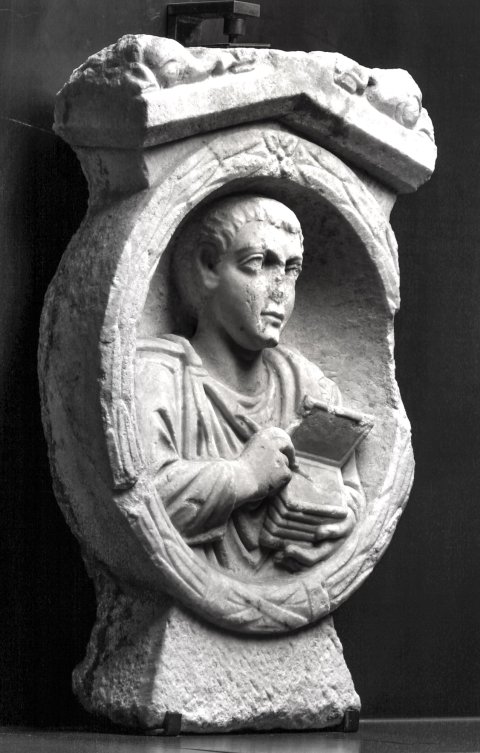 - In Lorbeerkranzrahmen Brustbild eines Mannes (Scriba - Librarius): bartlos, gesträhntes Haar, Ärmeltunica, Sagum mit Fransen, Bügelfibel, in der Rechten Stilus, in der Linken aufgeklapptes Polyptychon. Über dem Medaillon Giebel, darauf Delphine.