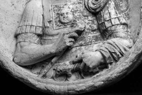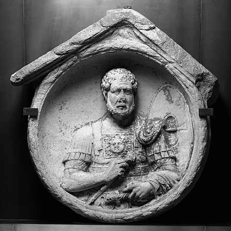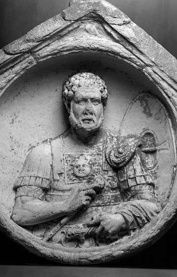- Halbfigur eines Mannes (Offizier - centurio) in Lorbeerkranzrahmen: bärtig, Locken, Tunica, Panzer mit Schulterlaschen und reliefverzierter Platte auf der Brust (Gorgoneion), breite Offiziersbinde, auf linker Schulter und linkem Arm Mantel. in der Rechten Centurionenstab (vitis). Waffen: in der Linken Schwertgriff mit Adlerkopf, neben der linken Schulter Ovalschild mit Handgriff. Über dem Medaillon Giebel.