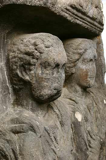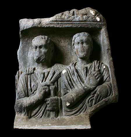 Im Hauptbild Familie: in Rechtecknische mit Giebel Brustbilder von drei (ursprünglich vier) Personen. Rechts Frau (Tochter ?): Frisur der Faustina Minor, Tunica, Mantel, Halsreif mit Lunula. Links daneben Mann: Bärtig, Locken, Tunica, Toga contabulata, in der Linken Rolle (volumen). Auf seiner rechten Schulter Hand (der Ehefrau ?).