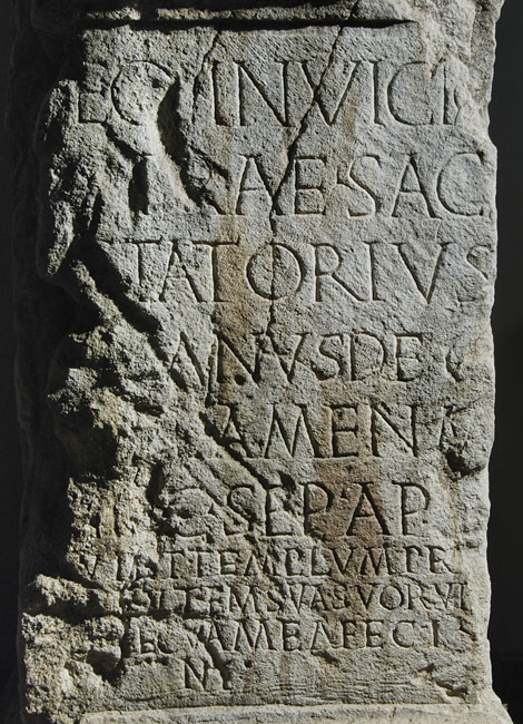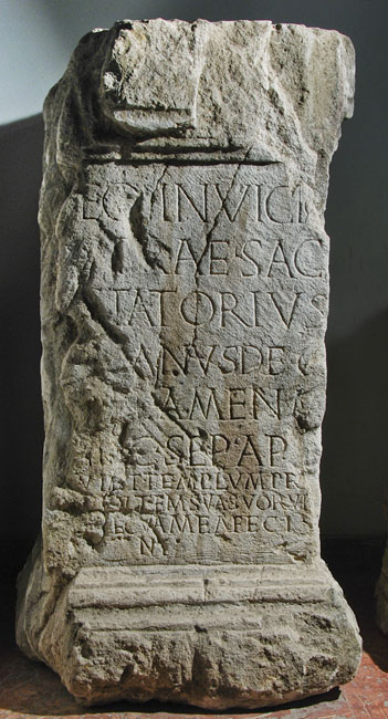 - [D]eo invicto / [Mi]t(h)rae sac(rum) / [.] Statorius / [....]anus dec(urio) / [et] flamen m/[uni]c(ipii) Sep(timii) Ap[ul(ensis)] / [in]victi templum pr[o] / [sal]utem sua suorum/[que p]ecunia mea feci