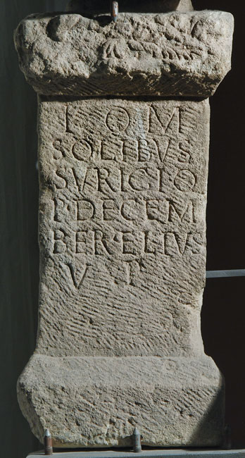 - I(ovi) O(ptimo) M(aximo) / Soli Bus/surigio P(ublius) Decem/ber (A)elius / v(oto) p(osuit).