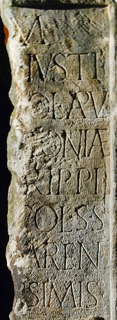 - [D(is)] M(anibus) / [---] Iusti / [--- c]ol(oniae) Apul(ensis) / [--- An]toniae / [--- Ag]rippi/[nus ---] col(oniae) s(upra) s(criptae) / [--- p]aren/[tibus pii]ssimis / [---]