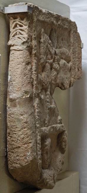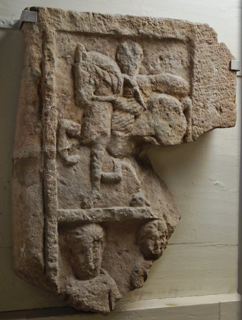 - Left lateral wall of an aedicula. Bordered by a column on the left; the relief is divided into two fields: above is depicted a horseman (Reiter), below two busts.