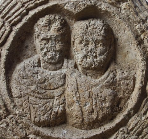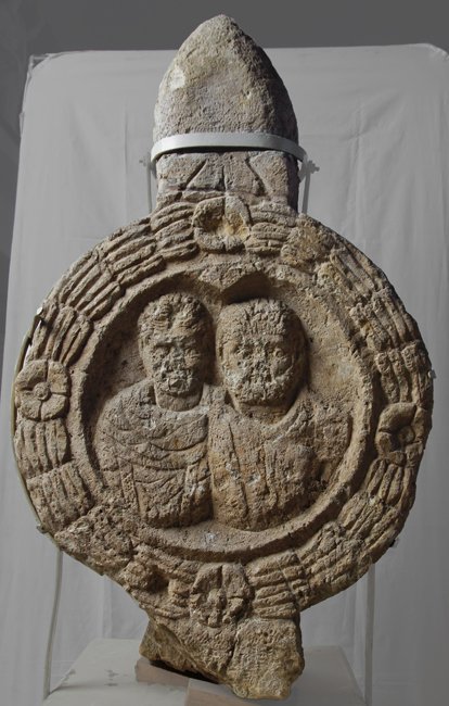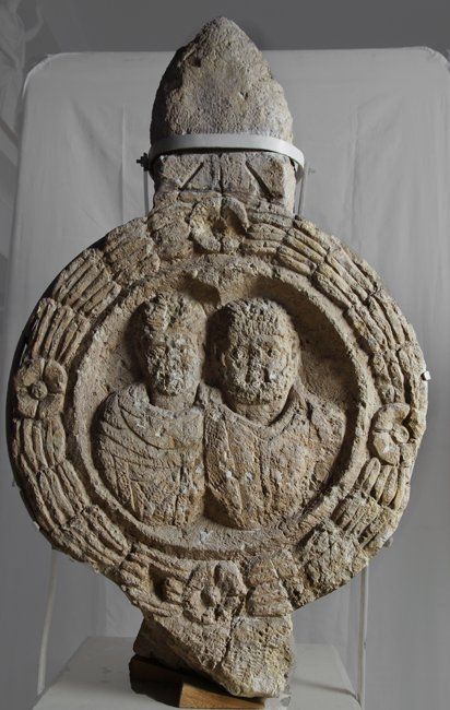 - Independent medallion; the upper part is decorated with a pine-cone (Pinienzapfen). The medallion, consisting of a shell-shaped niche (Muschelnische) surrounded by a corona (Lorbeerkranz mit Blüten), contains two busts (Ehepaar): a woman (on the left) and a man (on the right).
