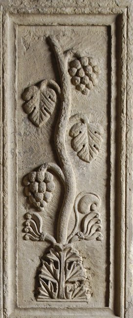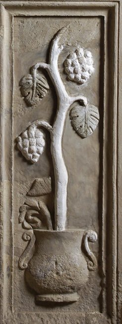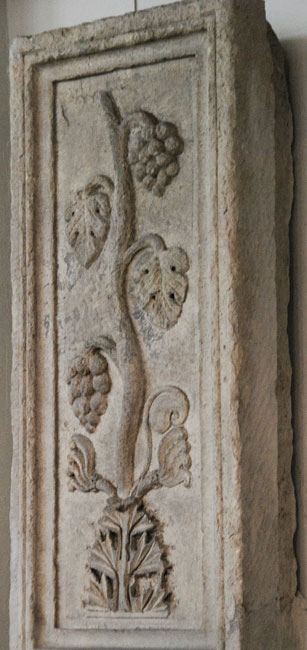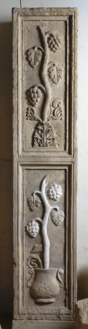 - Pilaster decorated with reliefs: In the upper register is reperesented a vine-stalk (Weinranke) with grapes rising from acanthus leaves. In the lower register vine-stalk with grapes rising from a kantharos (Krater).