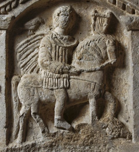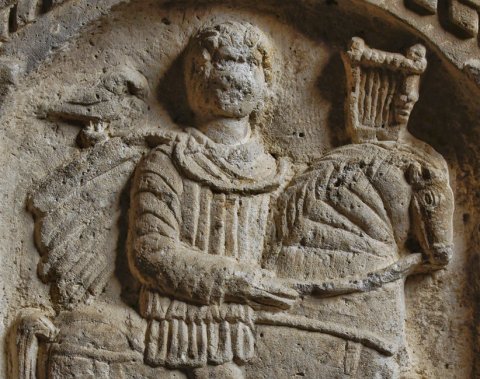 - Mythische Figur (Thrakischer Reiter), Musikinstrument. Votive stela, naiskos-aedicula type. Inside a naiskos a Thracian Horseman holding a lyra in his right hand.