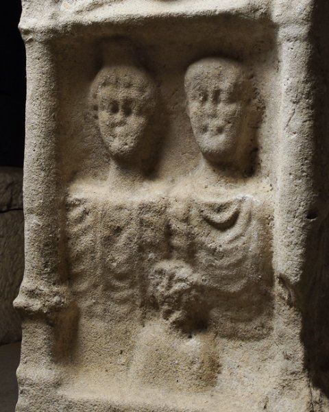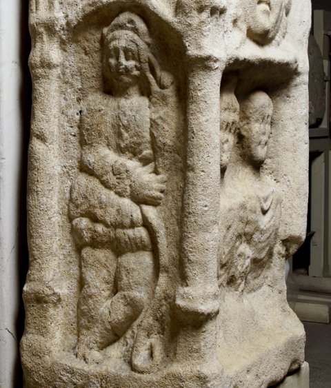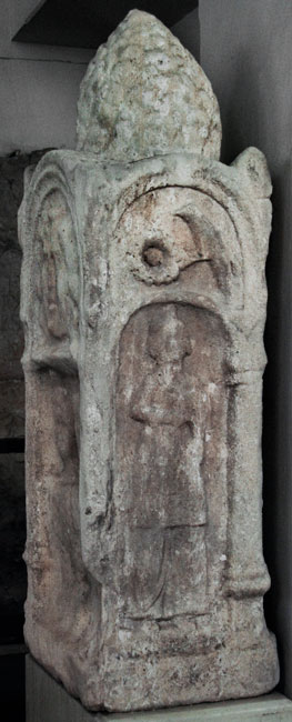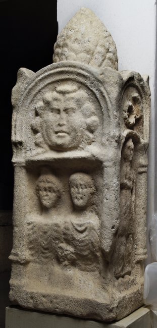 - The three faces of the monument are aedicula-shaped niches, with semi-circular pediments above, flanked by acroteria. The pediment of the main face is decorated with head of Medusa (Gorgoneion), below three busts : a woman on the left, a man on the right, in front of them a child (Familie, Ehepaar mit Kind). The left lateral face shows two dolphins in the pediment and Attis inside the niche. The right lateral face shows a rosette and a pigeion in the pediment and a standing female figure inside the niche. The top of the monument is decorated with a pine-cone (Pinienzapfen).