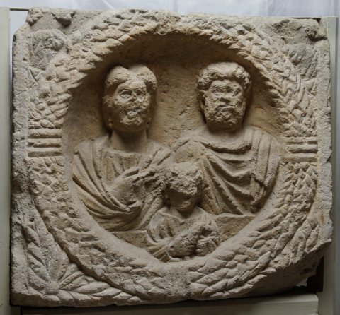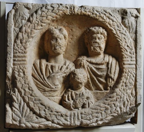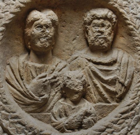 - The medallion, enclosed in a rectangular space, consist of a niche surrounded by a corona (Kranz) with taenia. Inside the medallion there are three busts: a man and a woman and in front of them a child (Familie, Ehepaar mit Kind). The upper corners are decorated with stylised leaves and the lower corners with acanthus leaves.