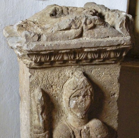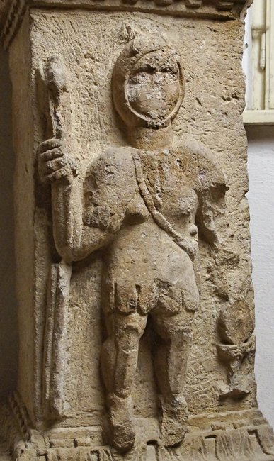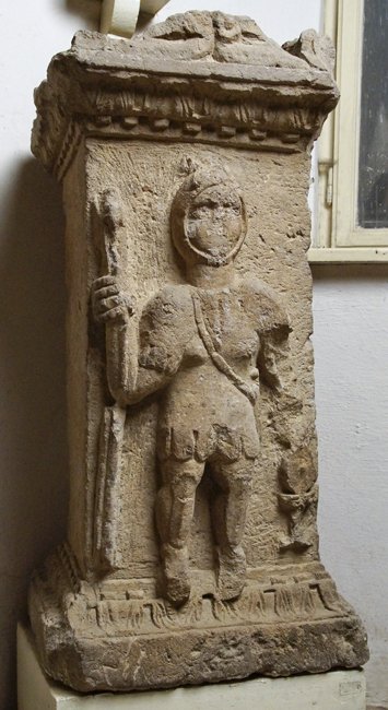 - The upper part shows a pediment flanked by pulvini and below, on three sides a cyma decorated with acanthus leaves and denticoli. The same decor on the base. On the front, in high relief, a soldier (Soldat mit Waffen: Helm, Panzer, Schwertgurt, Lanze).