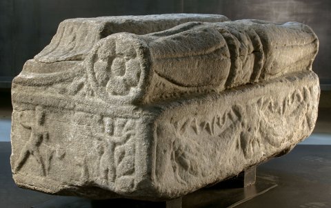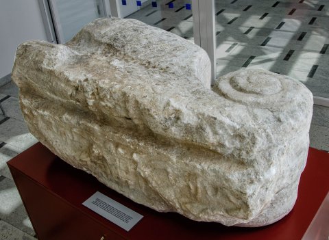 Volutenpolster (Pulvini) mit Rosette und Blattdekor, darüber Ansatz eines Pyramidenstumpfes mit Weinblattdekor.