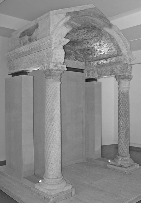 - Aus den erhaltenen Teilen wurde eine vorn und an den Seiten offene Aedicula rekonstruiert. Die Unterseite des Architravs deutet auf vorgezogene Seitenwangen hin. Vom Untergeschoss ist nichts erhalten.