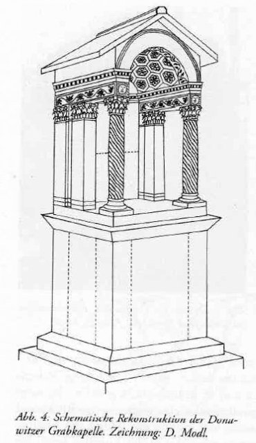 - erh. sind 1 Säule, Teile des Architravs und des Kranzgesimses der Seitenwangen, Dach