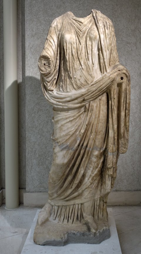 - Statue einer stehenden Frau in Ärmelchiton und Mantel. Die Falten sind grob gearbeitet. Die Rückseite der Statue ist abgeflacht, die einzelnen Faltenzüge sind jedoch angegeben.