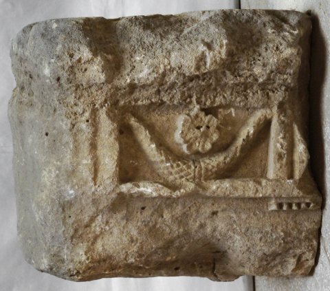 - Metope mit Girlande und Rosette, seitlich Reste von Triglyphen.