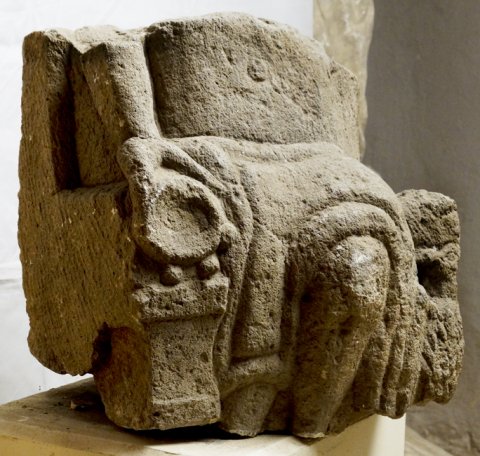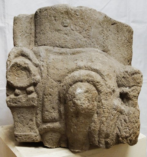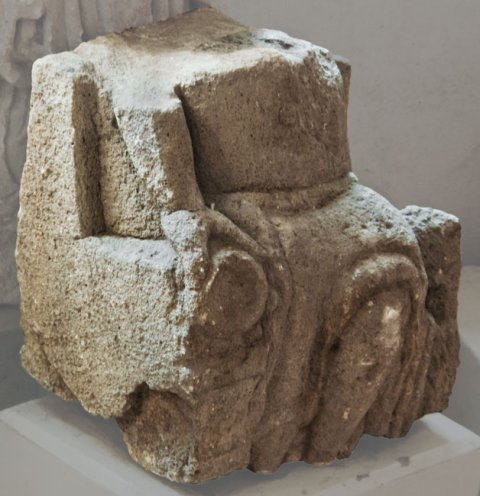 - Mythische Figur (Gott, Jupiter ? Kybele ?): semi-nude male god sitting on a throne, holding a patera in his right hand.