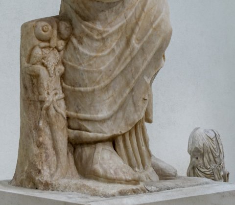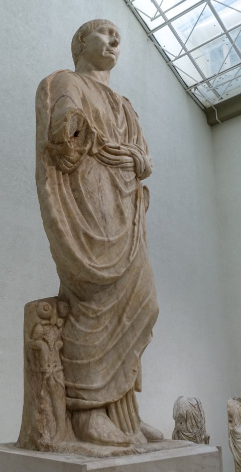- Historische Person: Statue des Trajan als Togatus. Als Stütze neben dem rechten Bein ein Füllhorn mit Trauben und Granatäpfeln. Das Haar ist in feinen Strähnen ins Gesicht gekämmt. Die Gesichtszüge sind markant herausgearbeitet, der Blick schweift in die Ferne. Die Rückseite der Statue ist in der Bearbeitung vernachlässigt.