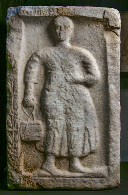 - Auf der Vorderseite in Muschelnische zwei Büsten (Ehepaar). Auf der linken Nebenseite in Rechtecknische Dienerin in halblangem Gewand mit Gürtel, in der Rechten Tasche, in der Linken Vogel. Auf dem Rahmen Blattornament. Auf der rechten Nebenseite Diener in kurzer Tunica, in der Linken mappa.