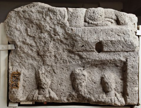 - Oben Reste von liegenden Löwen. Rechteckige Bildnische mit Porträts einer Familie (links Frau ?, in der Mitte Mann, rechts Knabe ?).