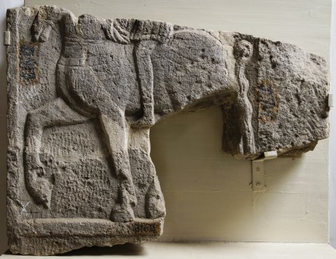 - The left lateral wall of aedicula shows a horseman (Reiter). On the right, an undecorated edge, The wall was divided into two registers.