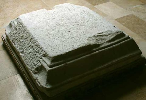 - Basisplatte mit Profilierung an vier Seiten, auf einer Seite Profil nur an den beiden Ecken, dazwischen abgeschrägte Bosse. Auf der links anschließenden Seite Zapfloch.