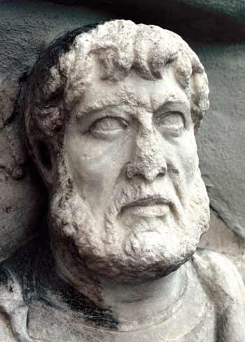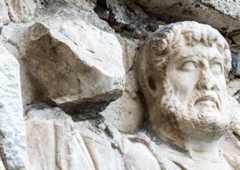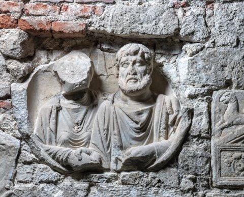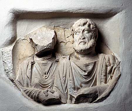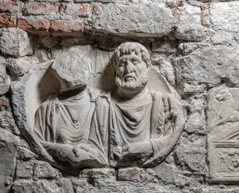 - Medaillon mit Muschelbaldachin in Form einer von Füllhörnern rahmenden Nische mit Giebel, darin zwei Brustbilder (Ehepaar). Links einheimische Frau: Haube, Umhang, Doppelknopffibeln, auf der Brust Fibel, zwei Halsreifen mit Lunula, Armreif. Rechts Mann: bärtig, Locken, Ärmeltunica, Sagum mit Fransen und Bügelfibel. Außen am Rahmen Pflanzenkandelaber