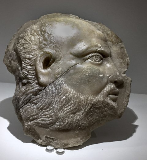 - Der Kopf des Mannes ist im Profil wiedergegeben. Sowohl Haar als auch Bart sind flach gestaltet, die Gesichtszüge sind jedoch sehr genau beobachtet. Die Stirn flieht nach hinten. In den Ohrmuscheln und im Auge wurde der Bohrer verwendet. Das Auge folgt nicht der Wendung des Kopfes sondern ist dem Betrachter frontal zugewendet.