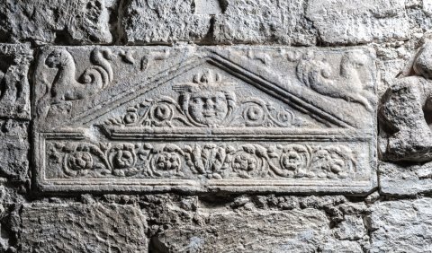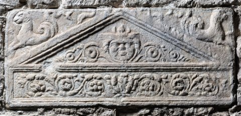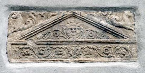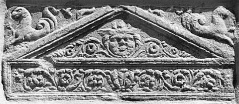 Eingeschriebener Giebel mit Gorgoneion zwischen Ranken, auf den Schrägen Meerwesen (Seepanther und Delphine).