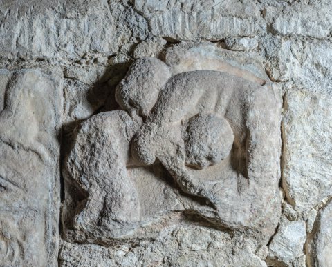 - Fragment, Oberfläche teilweise verwittert, Reste roter Farbe am Hintergrund