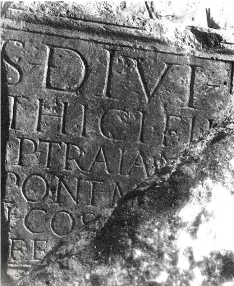 - [Imp(erator) Cae]s(ar) divi / [Traiani Par]thici fil(ius) / [divi Nervae ne]p(os) Traian[us] Hadrianus [Aug(ustus)] pont(ifex) m[ax(imus)] / [trib(unicia) potest(ate) VII]I co(n)s(ul) [III per] / leg(ionem) I adi(utricem) fec[it]