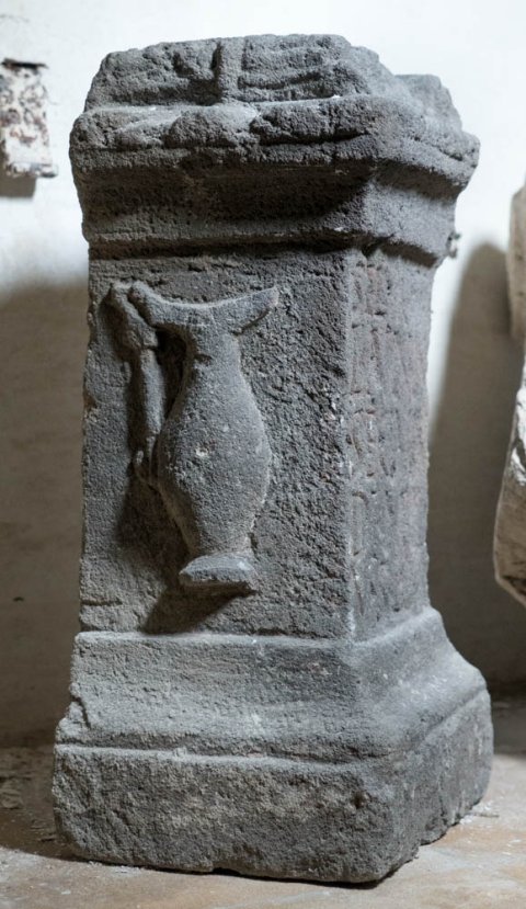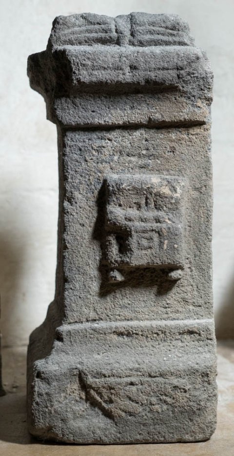 - Volutenpolster (pulvini) mit Rosetten, dazwischen zwei Blätter. Auf der linken Nebenseite Kanne, auf der rechten offenes Kästchen.