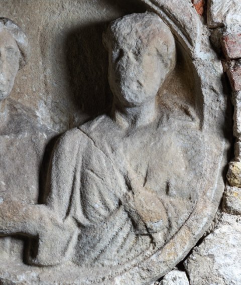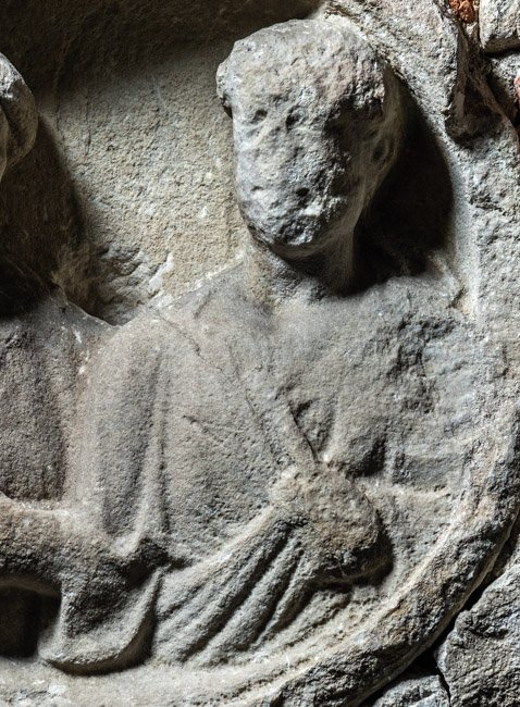 - In Lorbeerkranzrahmen mit außen anschließendem Flechtband zwei Halbfiguren (Ehepaar). Links einheimische Frau: Haube, Umhang, Flügelfibeln, Fibel auf der Brust, Halskette, Armreif. Rechts Mann: bärtig, Tunica, Toga, in der Linken Rolle (volumen). Über dem Medaillon Giebel, darauf 2 liegende Löwen, dazwischen Mittelakroter (Pinienzapfen?).