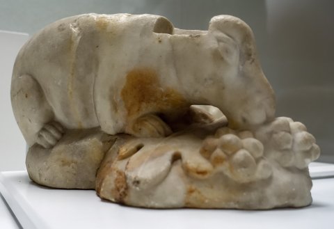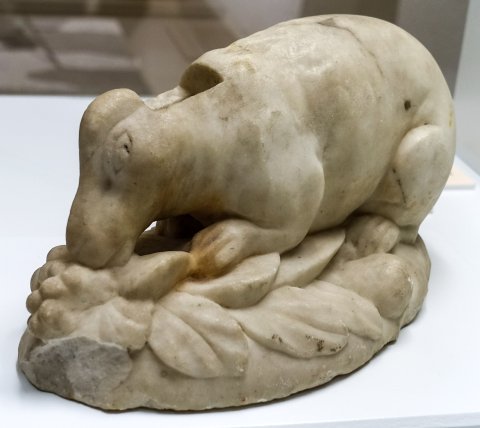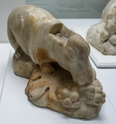 - Der Hase sitzt auf einem flachen Felsen und frißt an einem Büschel Trauben. Ähnliche Stücke in Marmor sind nicht bekannt, das Motiv kommt jedoch in der Malerei oder auf Mosaiken vor. Das Stück wurde zusammen mit einem weiteren Hasen (VI.2.13 = Nr. 12696) gefunden, die beiden bilden ein Zwillingspaar.