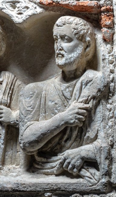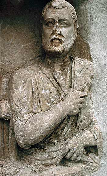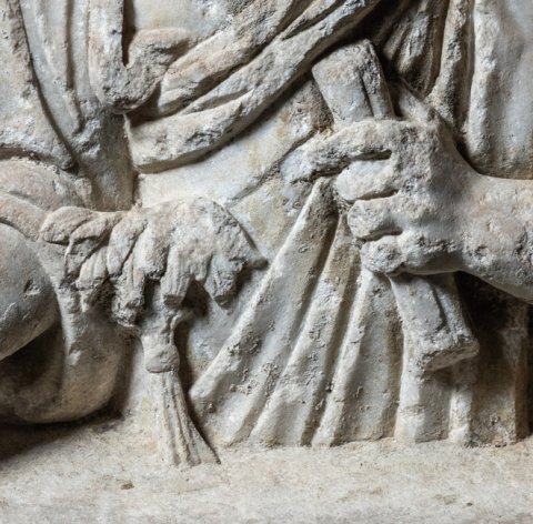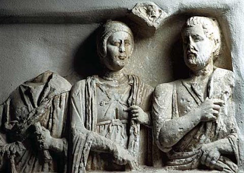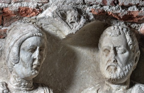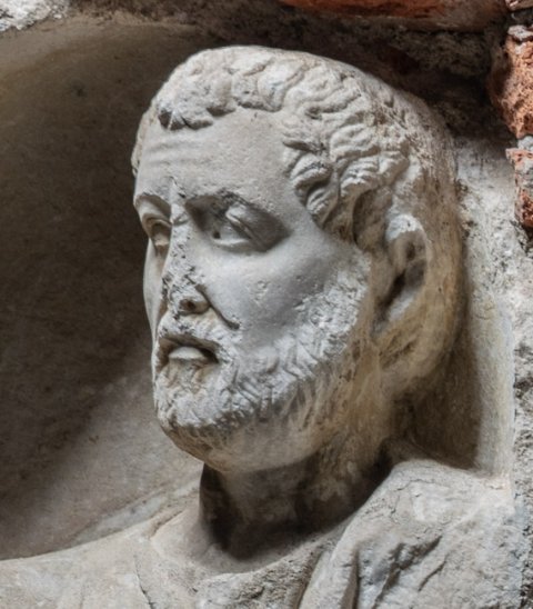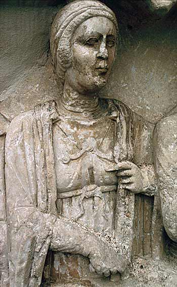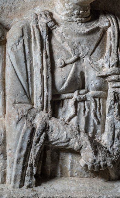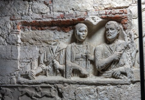 In Rechtecknische mit vier Bögen vier Halbfiguren einer Familie. Von links: Frau (nur rechte Hand erhalten). Mann: Tunica, Toga contabulata, in der Linken Rolle (volumen), Fingerring, an der rechten Seite kleines palmenförmiges Objekt. Einheimische Frau: Haube, gegürtetes Gewand, Doppelknopffibeln, Brustschmuck mit drei Scheiben, Umhang, Halskette, Halsreif mit Lunula, Armreifen. Rechts Mann: bärtig, Tunica, Toga contabulata, Fingerring.