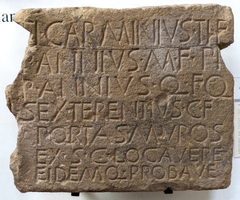 - Ti(berius) Carminius Ti(beri) f(ilius) / P(ublius) Annius M(ani) f(ilius) pr(aefecti) / P(ublius) Annius Q(uinti) f(ilius) q(uaestores) / Sex(tus) Terentius C(ai) f(ilius) / portas muros / ex s(enatus) c(onsulto) locavere / eidemq(ue) probave(re)
