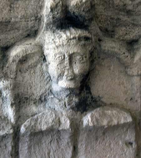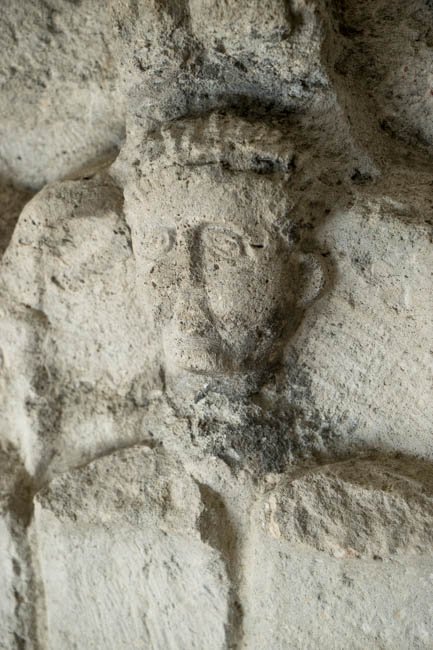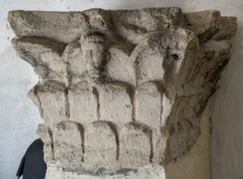 - Pfeilerkapitell mit drei Blattkränzen, in der Mite des oberen männlicher Kopf.