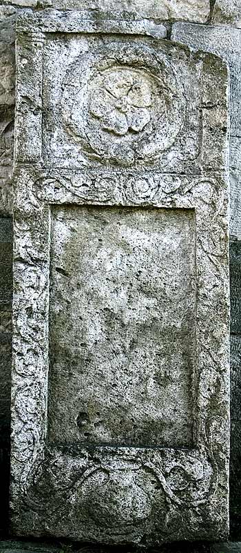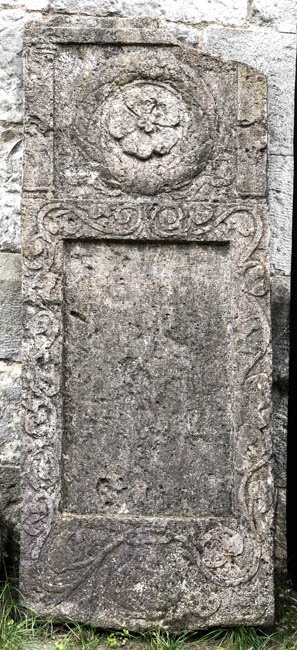 - Oben Bildfeld zwischen Säulen, darin Kranz mit Rosette. Leeres Schriftfeld, auf dem Sockelbild Gefäß, aus dem Ranken die seitlichen Rahmenleisten hinaufwachsen.