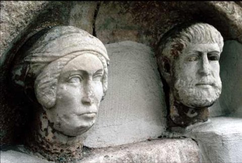 - Ehepaar: in glattem Rahmen nur Köpfe erhalten. Links einheimische Frau mit Haube und Halskette, rechts bärtiger Mann.