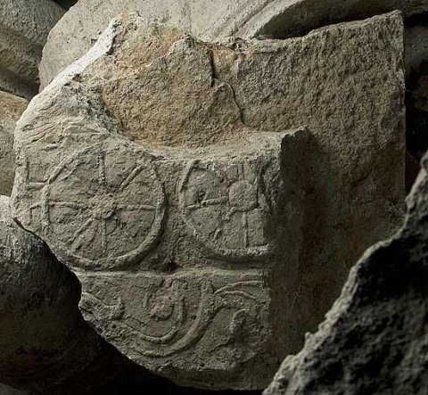 - Wagenszene: Räder eines vierrädrigen Wagens nach links, Kutscher und Rest vom Hinterteil eines Pferdes sichtbar. Unten Rankenfries.