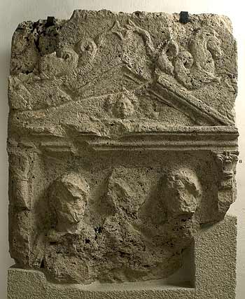 - Eingeschriebener, gerahmter Giebel mit Gorgoneion. Auf den Giebelschrägen links Delphin, rechts Hippokamp. Bildnische mit Familie zwischen Säulen: Halbfiguren (?) von drei Personen, links jüngerer Mann (bärtig, Sagum mit Scheibenfibel), rechts älterer bärtiger Mann, in der Mitte Frau (nur Umriss).