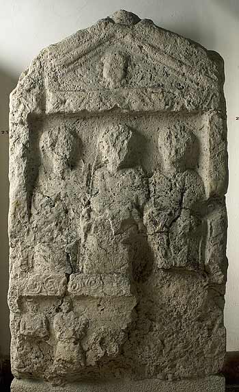 - Gerahmter Giebel mit Gorgoneion. Im Hauptbild Familie: drei sitzende Ganzfiguren, links einheimische Frau (Fibeln), in der Mitte Frau mit eckigem Gegenstand in den Händen, rechts Mann mit Trinkgefäß in der Rechten. Auf der oberen Rahmenleist Blattfries (?), auf der unteren Spiralranken. Zwischenbild mit Totenopfer: zwei Dienerinnen links eines Tisches.