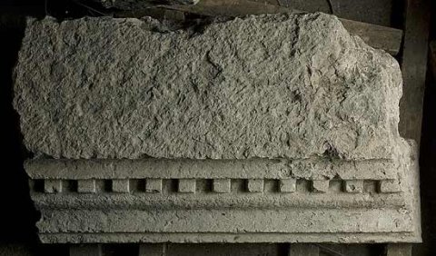 - Platte mit profiliertem Rand mit Zahnschnitt an einer Längskante. Teil einer Aedicula-Decke ?