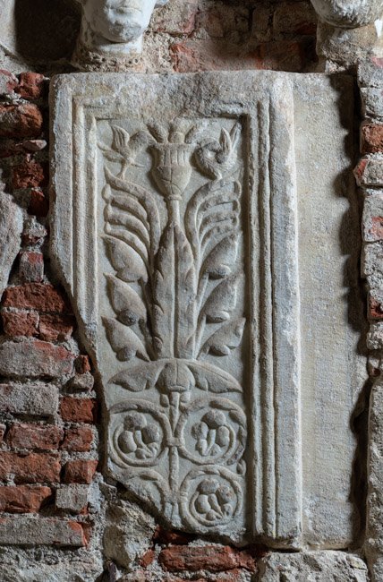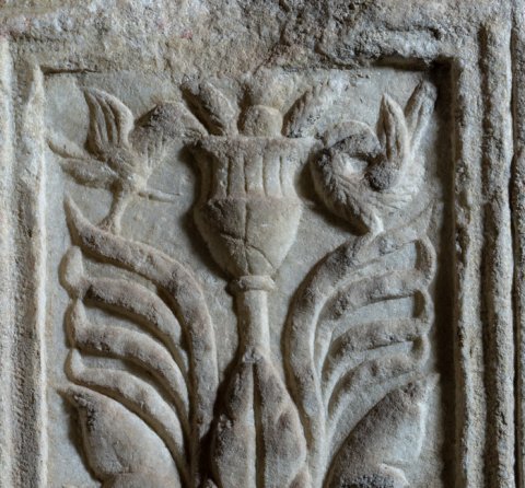 - Hochrechteckiges Feld mit Volutenranken mit Blüten, darüber Akanthusgewächs, das von einem Gefäß mit Früchten bekrönt wird. Neben dem Gefäß zwei Vögel.