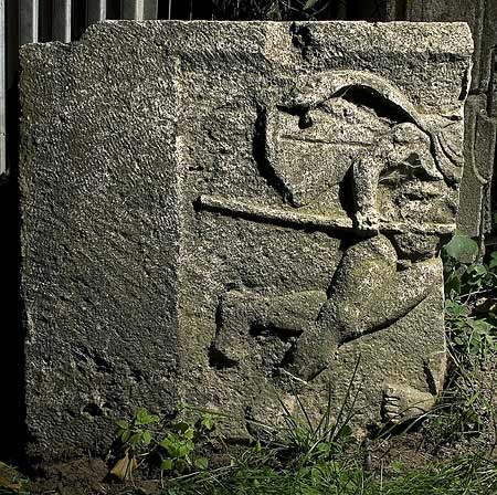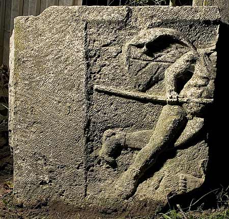 - Mythos : Eingetieftes Bildfeld mit nach rechts hin schwebendem Mars, nackt bis auf Schuhe und Mantel, in der Rechten Lanze. Unter ihm Fuß einer liegenden Figur (Rhea Silvia).