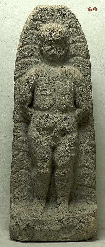 Vor einer ungerahmten, oben abgerundeten, durch eingeritze Bogenlinien gegliederten Fläche steht auf einem vorspringenden Sockel ein Mann mit auf den Rücken gelegten (gefesselten ?) Händen. Er ist nackt, das gesträhnte Haar fällt weit in die Stirn: Kriegsgefangener ?