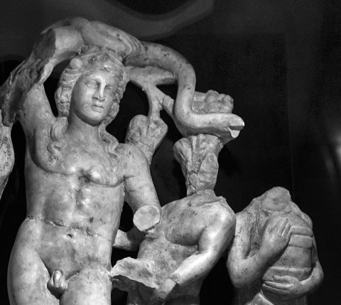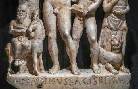 - Mythische Figuren: jugendlicher nackter Dionysos-Bacchus (Liber Pater) neben einem Weinstock mit Schlange. Rechts von ihm kleine Silensfigur auf Maultier, links nackter Satyr und bekleidete Frau mit Ciste in den Armen, vor ihr liegender Panther. Inschrift auf der Plinthe.
